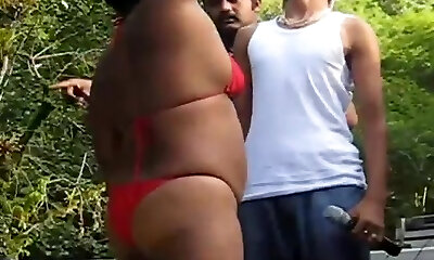 Mature milf and her young daughter in a public fitting room. Different swimsuits and mini swimsuits on sexy yam-sized ass.