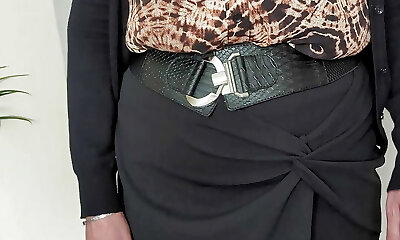 Going to work in a blouse, skirt ,pantyhose and heels. Ready for my younger boss to inspect my mature baps, ass and bald cunt.